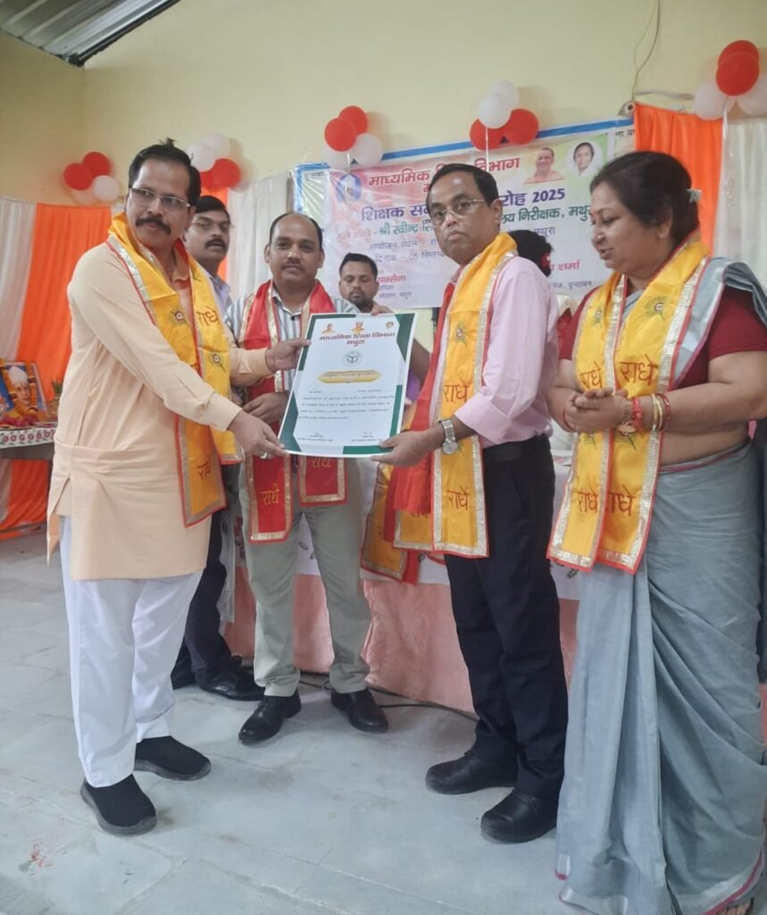 माध्यमिक शिक्षा विभाग द्वारा आयोजित शिक्षक सम्मान समारोह–2025 में मथुरा नगर के प्रतिष्ठित कृष्ण चन्द्र गान्धी सरस्वती विद्या मन्दिर इण्टर कॉलेज माधवकुञ्ज मथुरा के विद्यालय ने एक बार फिर गौरवपूर्ण उपलब्धि हासिल की। विद्यालय को बोर्ड परीक्षा परिणाम में उत्कृष्ट प्रदर्शन के आधार पर विद्यालय के यशस्वी प्रधानाचार्य श्री विनय कुमार सिंह तथा विद्यालय के घोष प्रमुख श्री सीताराम बघेल को राज्य स्तर पर घोष के उत्कृष्ट प्रदर्शन हेतु मा. जिला विद्यालय निरीक्षक श्री रवीन्द्र सिंह द्वारा द्वारा “उत्कृष्ट शिक्षक सम्मान” से अलंकृत किया गया।