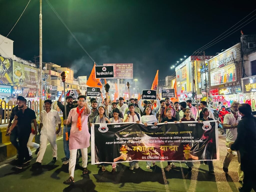 गोरखपुर । अखिल भारतीय विद्यार्थी परिषद (अभाविप) गोरक्ष प्रांत की गोरखपुर महानगर इकाई ने शुक्रवार को मशाल यात्रा निकालकर श्रीराम स्वरूप मेमोरियल विश्वविद्यालय, बाराबंकी में हो रहे शैक्षिक भ्रष्टाचार और शांतिपूर्ण आंदोलन कर रहे कार्यकर्ताओं पर हुए बर्बर पुलिसिया लाठीचार्ज का विरोध किया।