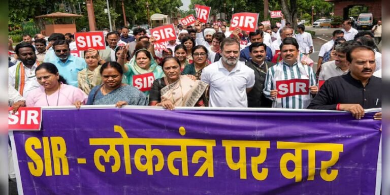 - विपक्षी सांसदों ने एक बड़ा बैनर भी ले रखा था, जिस पर ‘एसआईआर- लोकतंत्र पर वार’ लिखा हुआ था.